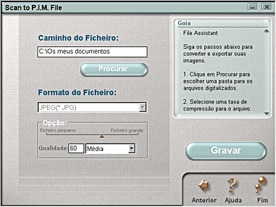 Utilize esta aplicação para digitalizar, converter e guardar a imagem numa pasta específica. Quando utiliza esta função, a imagem é digitalizada a partir do EPSON TWAIN e é apresentada na caixa de diálogo do assistente de verificação. Faça clique em Terminar e aparecerá a caixa de diálogo apresentada em seguida. Para mais informações, consulte a documentação do EPSON Smart Panel.
