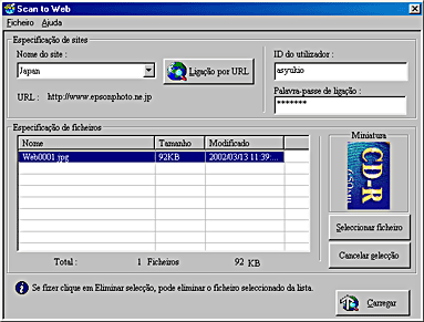 Utilize esta aplicação para digitalizar uma imagem utilizando a tecnologia PRINT Image Matching e, em seguida, carregá-la para o site de partilha de fotografias da EPSON. Quando inicia esta aplicação, a imagem é digitalizada a partir do EPSON TWAIN e é apresentada na caixa de diálogo do assistente de verificação. Faça clique em Terminar e aparecerá a caixa de diálogo apresentada em seguida. Faça clique em Carregar para carregar a imagem. Para mais informações, consulte a documentação do EPSON Smart Panel. Tenha em atenção que as informações do PRINT Image Matching são incluídas em todos os ficheiros de imagem digitalizados.