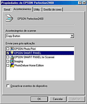 Pode atribuir aos botões do digitalizador uma outra aplicação, em substituição do EPSON Smart Panel, que suporte os acontecimentos do digitalizador (por exemplo, o Imaging for Windows, desde que esteja instalado) em Windows. Quando pressionar o botão Iniciar
