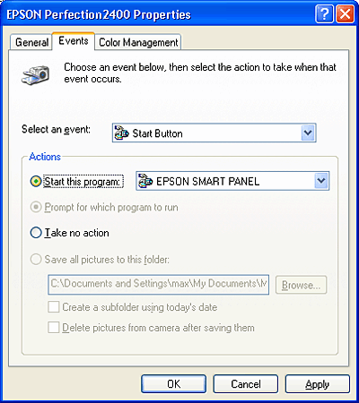 Se necessitar de desactivar os acontecimentos de digitalizador, seleccioneNão empreender nenhuma acção na caixa de diálogo Propriedades do digitalizador.