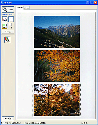 Quando já tiver definido o tamanho de impressão da imagem digitalizada, seleccione uma definição adequada na lista Tamanho do Alvo. Aparecerá uma demarcação proporcional às medidas estabelecidas na definição do tamanho do alvo da janela Antever. Pode mover esta demarcação para a área da imagem que pretende digitalizar. Para mais informações, consulte a ajuda interactiva.