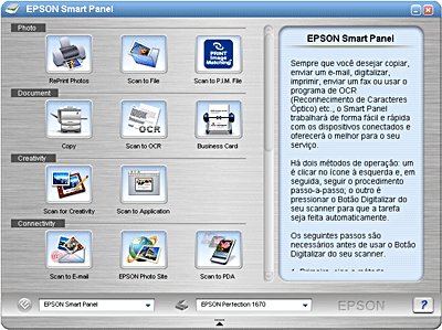 O EPSON Smart Panel permite digitalizar e enviar dados directamente para uma aplicação atribuída, para o site de partilha de fotografias da EPSON ou para o seu PDA (assistente digital pessoal). Pode também obter fotografias e documentos em formato digital de uma forma rápida e simples.
