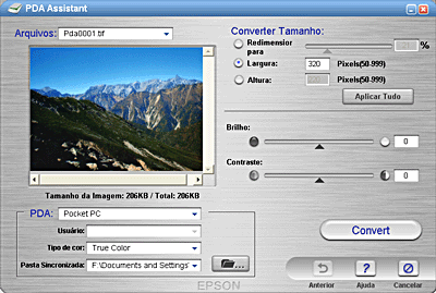 Utilize esta aplicação para digitalizar e converter uma imagem num formato de ficheiro compatível com PDA. Quando inicia esta aplicação, a imagem é digitalizada a partir do EPSON Scan e é apresentada na caixa de diálogo do assistente de verificação (Verify Assistant). Faça clique em Seguinte e aparecerá a caixa de diálogo apresentada em seguida. Faça clique na opção de conversão para exportar a imagem para a pasta Sync ou para a pasta especificada.