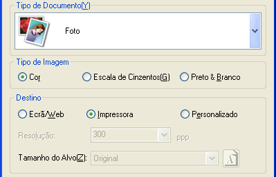 Especifique as definições Tipo de Documento, Tipo de Imagem e Destino em função das imagens.