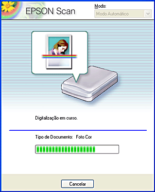 É apresentada a janela seguinte com uma barra de evolução a indicar a evolução do processo de digitalização. Pode ver o tipo de documento que está a ser digitalizado. Quando digitalizar várias fotografias, pode também visualizar o número de imagens digitalizadas.