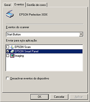 Pode atribuir aos botões do digitalizador uma outra aplicação, que não o EPSON Smart Panel, que suporte os eventos do digitalizador (por exemplo, o Imaging for Windows, desde que esteja instalado) em Windows. Ao pressionar o botão Iniciar