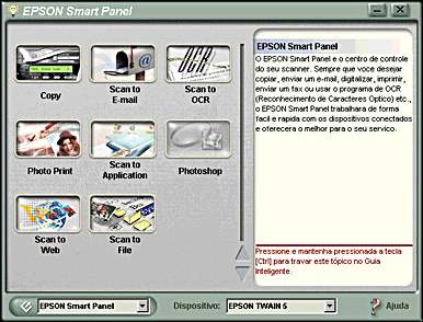 A janela do EPSON Smart Panel contém as aplicações apresentadas em seguida.