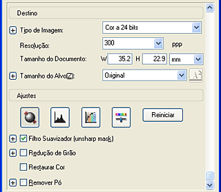 ![]() | Utilize o Tamanho do alvo para especificar o tamanho de saída da imagem digitalizada. Especifique também as definições de ajuste, se necessário. Para mais informações, consulte Criar Reproduções de Qualidade. |