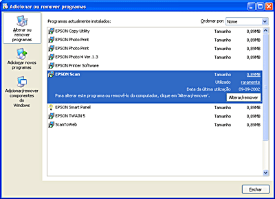 Seleccione EPSON Scan a partir da lista e, em seguida, faça clique em Alterar/Remover (Windows XP ou 2000) ou Adicionar/Remover (Windows Me ou 98 SE).
