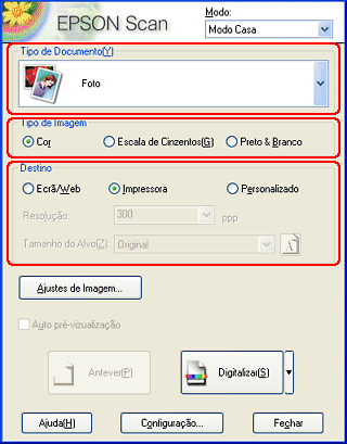 ![]() | Na janela principal do EPSON Scan, efectue as definições Tipo de Documento, Tipo de Imagem e Destino. |