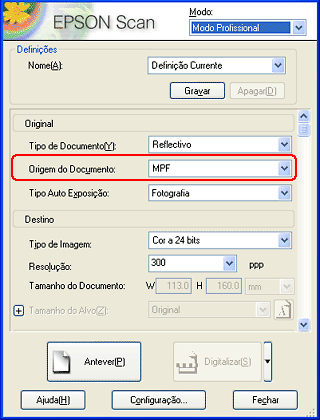 ![]() | Na janela principal do EPSON Scan, certifique-se que a opção AMF está seleccionada da lista Origem do Documento e efectue as definições de digitalização adequadas. |