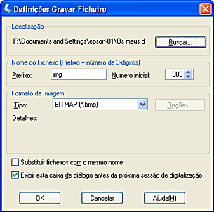 ![]() | Especifique o local onde pretende guardar as imagens digitalizadas. Se pretender alterar a localização predefinida, faça clique na tecla de busca (Windows) ou na tecla de selecção (Macintosh) e seleccione a pasta pretendida. |