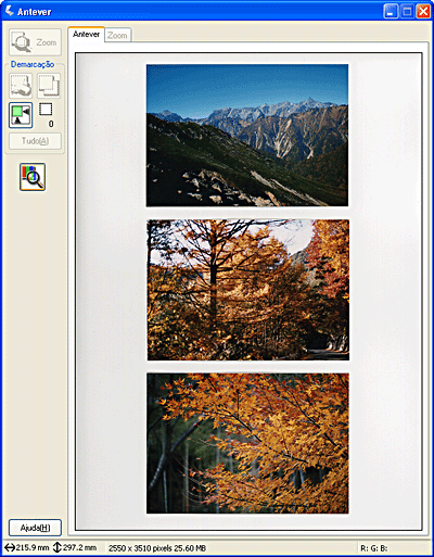 O método de pré-visualização normal permite ver toda a imagem pré-visualizada e os efeitos das definições que efectuou. Permite ainda efectuar ajustes de imagem adicionais. Pode também utilizar demarcações para digitalizar apenas as partes seleccionadas de uma imagem. Para mais informações sobre demarcações, consulte Utilizar Demarcações.