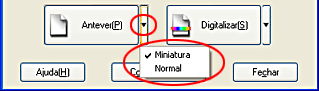 Faça clique na tecla Antever para iniciar a pré-digitalização e pré-visualizar a imagem. Consoante o modo e as definições do tipo de documento, poderá aparecer uma pequena seta situada à direita da tecla Antever que lhe permite seleccionar um método de pré-visualização. Faça clique na seta e seleccione Miniatura ou Normal para alterar o método de pré-visualização.