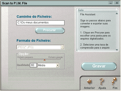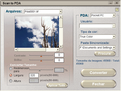 Utilize esta aplicação para digitalizar e converter uma imagem num formato de ficheiro compatível com PDA. Quando inicia esta aplicação, a imagem é digitalizada a partir do EPSON Scan e é apresentada na caixa de diálogo do assistente de verificação (Verify Assistant). Faça clique em Terminar e aparecerá a caixa de diálogo apresentada em seguida. Faça clique na opção de conversão para exportar a imagem para a pasta Sync ou para a pasta especificada.