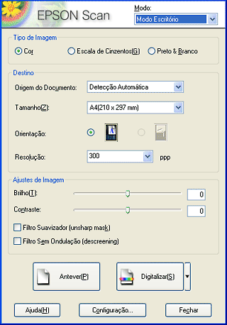 Inicie o EPSON Scan e, em seguida, seleccione o modo escritório. Para mais informações sobre como seleccionar um modo de digitalização, consulte Alterar o modo de digitalização.