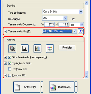 ![]() | Utilize a opção Tamanho do Alvo para especificar o tamanho de saída da imagem digitalizada. Efectue igualmente as definições de ajuste, se necessário. (é possível que tenha de arrastar a barra de deslizamento para ver a parte inferior do ecrã). Para mais informações, consulte Criar Reproduções de Qualidade. |