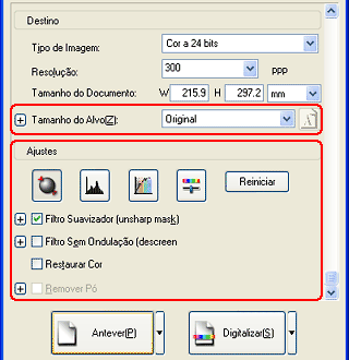 Especifique o tamanho de saída da imagem digitalizada em Tamanho do Alvo e efectue as definições de ajuste, se necessário (é possível que tenha de arrastar a barra de deslizamento para ver a parte inferior do ecrã).