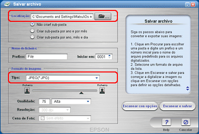 Especifique as definições Localização, Nome do Ficheiro e Formato de Imagem. Para o tipo de formato do ficheiro, seleccione Print Image Matching II (JPEG) ou Print Image Matching II (TIFF) a partir da lista de tipo.