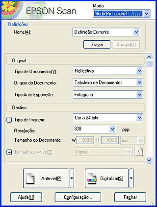 ![]() | Inicie o EPSON Scan e, em seguida, seleccione o modo profissional. Para mais informações sobre como seleccionar um modo de digitalização, consulte Alterar o modo de digitalização. |