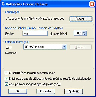 Para guardar as imagens digitalizadas sem as editar numa aplicação, inicie directamente o EPSON Scan. Depois de digitalizar as imagens, estas são automaticamente guardadas como ficheiros na pasta especificada na caixa de diálogo Definições Gravar Ficheiro. Pode configurar esta operação da seguinte forma: