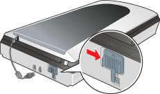 Abra a tampa do digitalizador e faça deslizar a patilha de protecção do leitor de transparências para a posição de bloqueio. Em seguida, feche a tampa do digitalizador.
