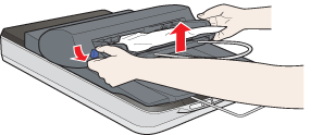 Puxe cuidadosamente o papel encravado para fora do alimentador a partir da parte superior ou inferior. Não puxe o papel com demasiada força. Se o fizer, o papel poderá rasgar, dificultando a sua remoção. Em seguida, liberte a alavanca de libertação.
