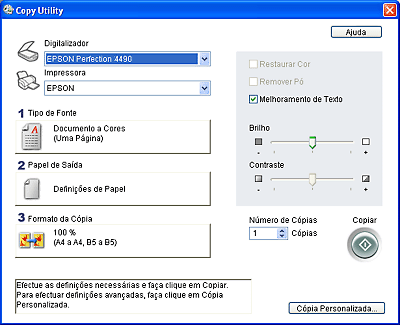 Se pretender pré-visualizar a digitalização antes de a imprimir ou efectuar definições de cópia adicionais, faça clique na tecla Cópia Personalizada situada na parte inferior da janela. Para mais informações sobre como utilizar as funções de Cópia Personalizada, faça clique em Ajuda no Copy Utility.
