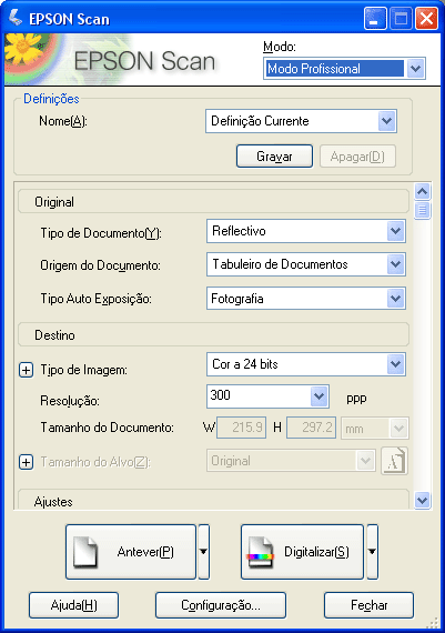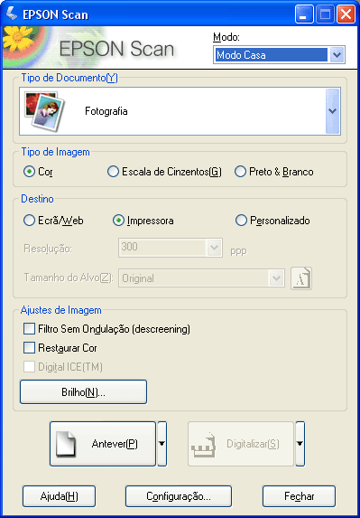O modo que seleccionar será o modo utilizado da próxima vez que iniciar o EPSON Scan.