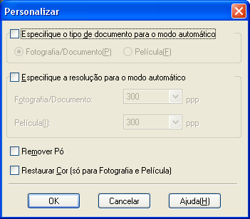 O modo automático é o ideal quando pretende digitalizar documentos ou fotografias com um formato de 100% e não necessita de pré-visualizar as imagens antes de efectuar a digitalização. Pode restaurar as cores esbatidas fazendo clique na tecla Personalizar.