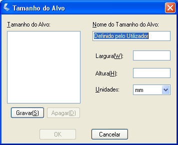 Escreva o nome do tamanho personalizado, introduza o tamanho, faça clique na tecla Guardar e, em seguida, faça clique em OK. O novo tamanho aparece na lista Tamanho do Alvo.
