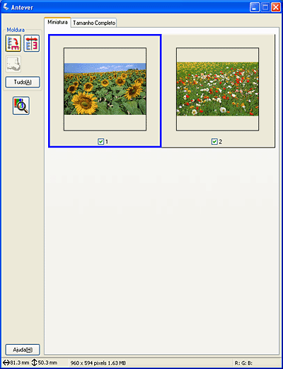 A pré-visualização de miniaturas mostra as miniaturas das imagens pré-visualizadas. O EPSON Scan localiza automaticamente as margens da área de digitalização e aplica as definições de exposição automática às imagens. O tipo de pré-visualização predefinido no modo casa é Miniatura, mas também o pode seleccionar no modo profissional, se estiver disponível.