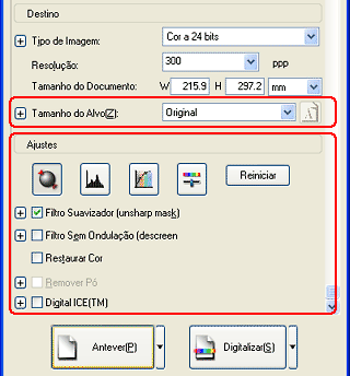 ![]() | Utilize a opção Tamanho do Alvo para especificar o tamanho de impressão da imagem digitalizada. Se necessário, especifique também as definições de ajuste. Para mais informações, consulte Criar Reproduções de Qualidade (é possível que tenha de arrastar a barra de deslizamento para ver a parte inferior do ecrã). |