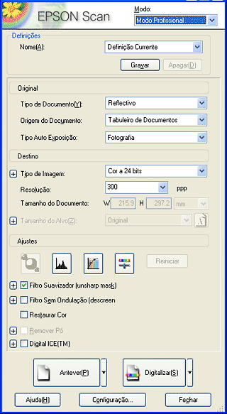 Para efectuar as definições adequadas para a digitalização de documentos e fotografias (documentos reflexivos) no modo profissional, execute as seguintes operações: