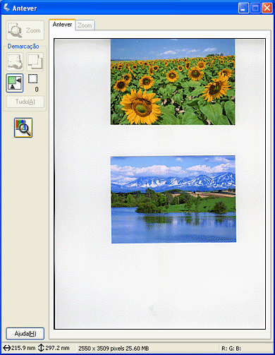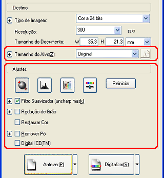 Quando já tiver definido o tamanho de impressão da imagem digitalizada, seleccione uma definição adequada na lista Tamanho do Alvo. Aparecerá uma demarcação proporcional às medidas estabelecidas na definição do tamanho do alvo na janela Antever. Pode mover esta demarcação para a área da imagem que pretende digitalizar. Para mais informações, consulte a ajuda interactiva.