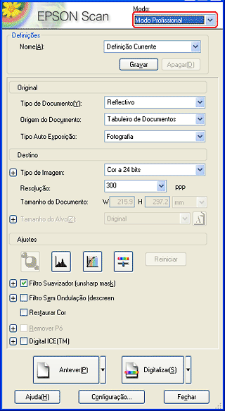 Inicie o EPSON Scan e, em seguida, seleccione o modo profissional. Para obter mais informações sobre como seleccionar um modo de digitalização, consulte Alterar o modo de digitalização.