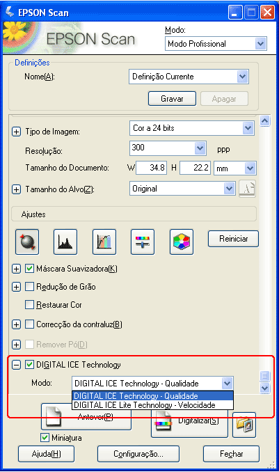 Modo Profissional: percorra para baixo até à área de Ajustes e clique na caixa de verificação Digital ICE Technology. Se pretender diminuir o nível do efeito da correcção Digital ICE Technology, faça clique na tecla + (Windows) ou  (Macintosh) situada junto à opção e seleccione a definição Digital ICE Lite Technology na lista Modo.