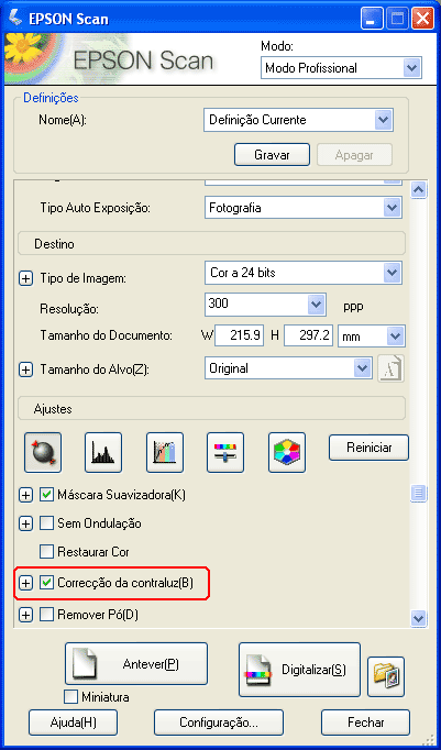 Execute as operações que se seguem para corrigir fotografias com contraluz utilizando o Epson Scan.