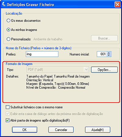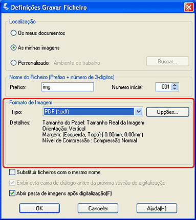 Efectue as definições correspondentes ao documento e faça clique em OK. Volta a aparecer a janela Definições Gravar Ficheiro.