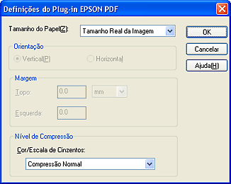 Se necessitar de alterar qualquer uma das actuais definições de PDF, clique no botão Opções. Aparece a janela Definições do Plug-in Epson PDF.