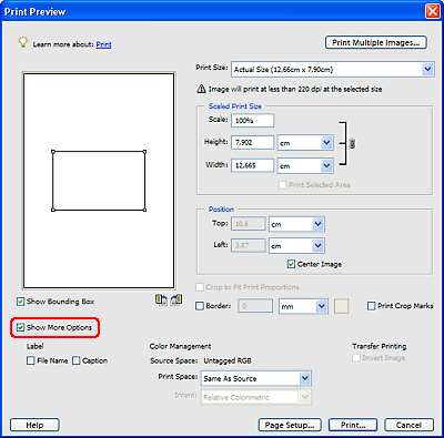 Clique na caixa Show More Options (Mostrar Mais Opções) e seleccione Same As Source (Igual à Entrada) como definição de Print Space (Espaço de Impressão).
