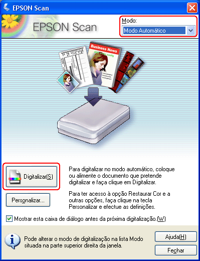 Se a caixa de Modo situada no canto superior direito da janela estiver definida para Modo Automático, clique no botão Digitalizar. O Epson Scan digitaliza automaticamente a imagem e guarda-a como ficheiro JPEG na pasta Imagens ou As minhas imagens. Para mais informações sobre como seleccionar as definições opcionais, consulte Utilizar o Modo Automático. ![]()