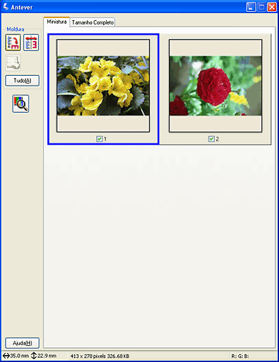 A pré-visualização de Miniatura mostra as miniaturas das imagens pré-visualizadas. O Epson Scan localiza automaticamente as margens da área de digitalização e aplica as definições de exposição automática às imagens. É o tipo de pré-visualização predefinido quando digitalizar películas ou diapositivos.