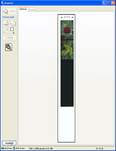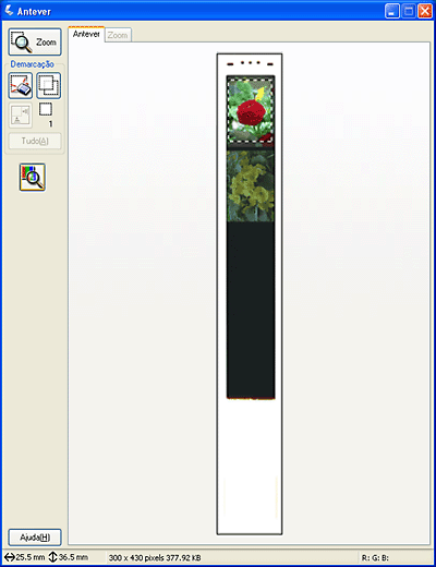 Para ampliar uma imagem, faça clique no interior da área de digitalização e na tecla Zoom. O Epson Scan volta a efectuar uma pré-digitalização e apresenta uma pré-visualização maior no separador Zoom. (As outras imagens continuam a ser pré-visualizadas com o formato original no separador Antever.)