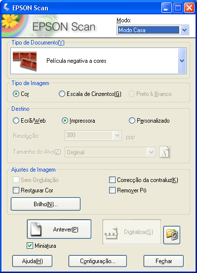 O Modo Automático é o ideal quando se pretende digitalizar imagens com um formato de 100% e não é necessário pré-visualizar as imagens antes de efectuar a digitalização. Pode restaurar as cores esbatidas ou remover o pó clicando no botão Personalizar. Para mais informações sobre como digitalizar neste modo, consulte Utilizar o Modo Automático. Nota: