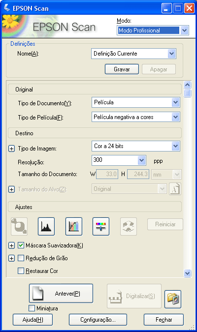O Modo Casa é o ideal quando se pretende pré-visualizar imagens de fotografias, películas ou diapositivos antes de efectuar a digitalização. Pode dimensionar a imagem à medida que a digitaliza, ajustar a área de digitalização e ajustar muitas definições de imagem, incluindo a restauração de cor, a função Digital ICE Technology (apenas para diapositivos e películas a cores) e a correcção da contraluz. Consulte Alterar o modo de digitalização, para obter mais informações sobre como mudar para o Modo Casa. Para mais informações sobre as operações de digitalização, consulte Efectuar definições básicas. O Modo Profissional permite controlar totalmente as definições de digitalização e ver os respectivos efeitos numa imagem pré-visualizada.