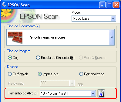 Se pretender ampliar as imagens no Epson Scan para as poder utilizar com um formato superior, pode aceitar a definição de Resolução efectuada pelo Epson Scan com base na definição de Destino (apenas no Modo Casa).