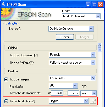 Definições de Original. Estas informam o Epson Scan sobre o tipo de películas ou diapositivos que está a digitalizar.