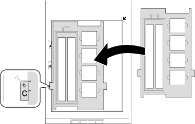 Coloque o suporte para películas no tabuleiro de documentos, de modo a que fique alinhado conforme indicado. Certifique-se de que o separador com a indicação "C" do suporte para películas fica encaixado na área com a indicação "C" do digitalizador.