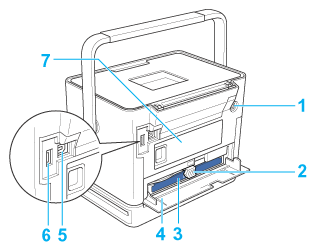6. Porta de interface (USB) EXT.: Utilizada para ligar a impressora ao adaptador de impressão fotográfica Bluetooth opcional e a câmaras digitais que possuam a funcionalidade USB DIRECT-PRINT.
